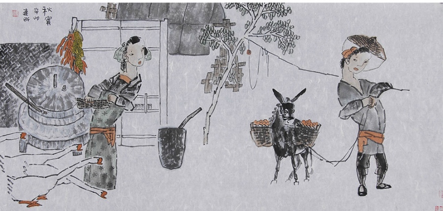郭先生笔下人物神情与姿态间有一种“标志”性的东西,个性明显,风格独具。眉眼的勾勒和色墨的搭配运用隐约透露出古典连环画的影响,却并非直接照搬;画面在保持古雅风韵的同时,张扬着画家独特的审美。