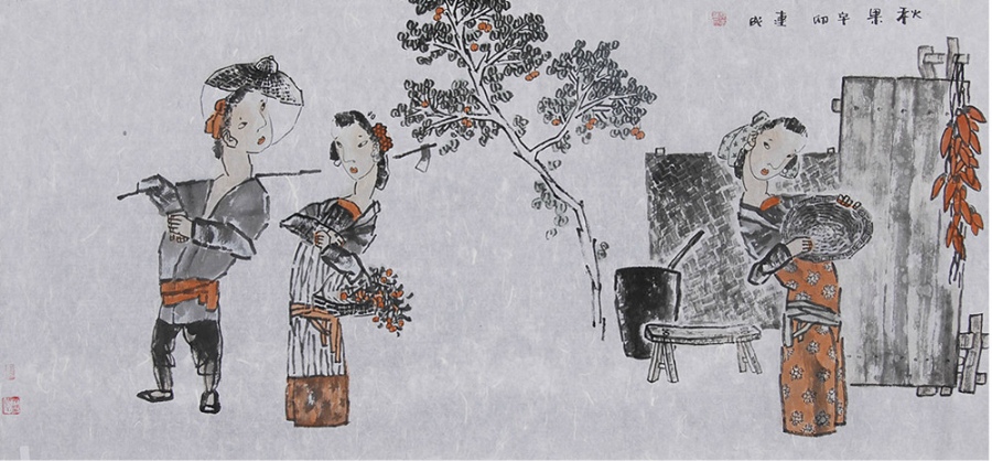 郭先生笔下人物神情与姿态间有一种“标志”性的东西,个性明显,风格独具。眉眼的勾勒和色墨的搭配运用隐约透露出古典连环画的影响,却并非直接照搬;画面在保持古雅风韵的同时,张扬着画家独特的审美。