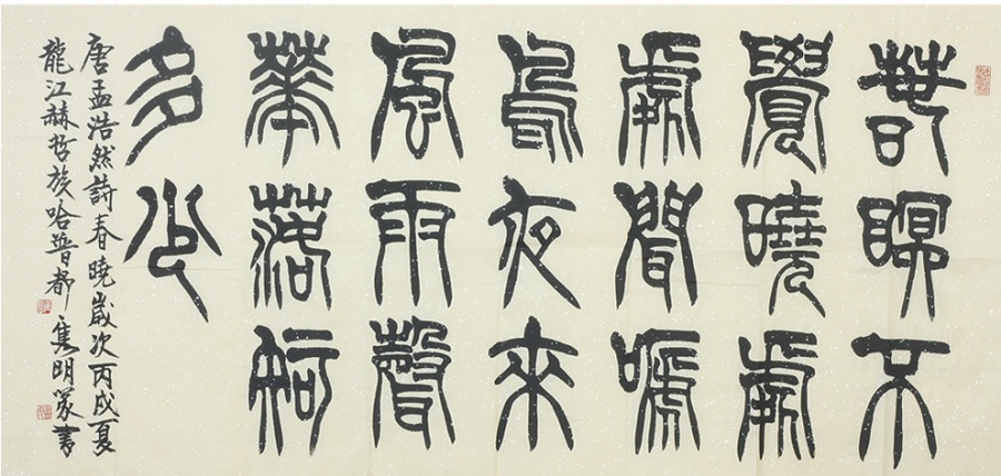 528 哈普都·隽明,赫哲族人,1945年生,吉林省吉林市人。现在是中国书法家协会理事、黑龙江书协副主席、吉林书画苑印社社员、一级美术师。他还获得过许多奖项,吉林书画苑(院)推荐书法家。 自幼爱好书法篆刻,篆刻师从李文新,书法得游寿指教。篆刻作品含蓄沉稳、柔而有刚;书法作品朴拙苍古、严整端凝。1983年篆刻作品《温故知新》获全国篆刻征稿评